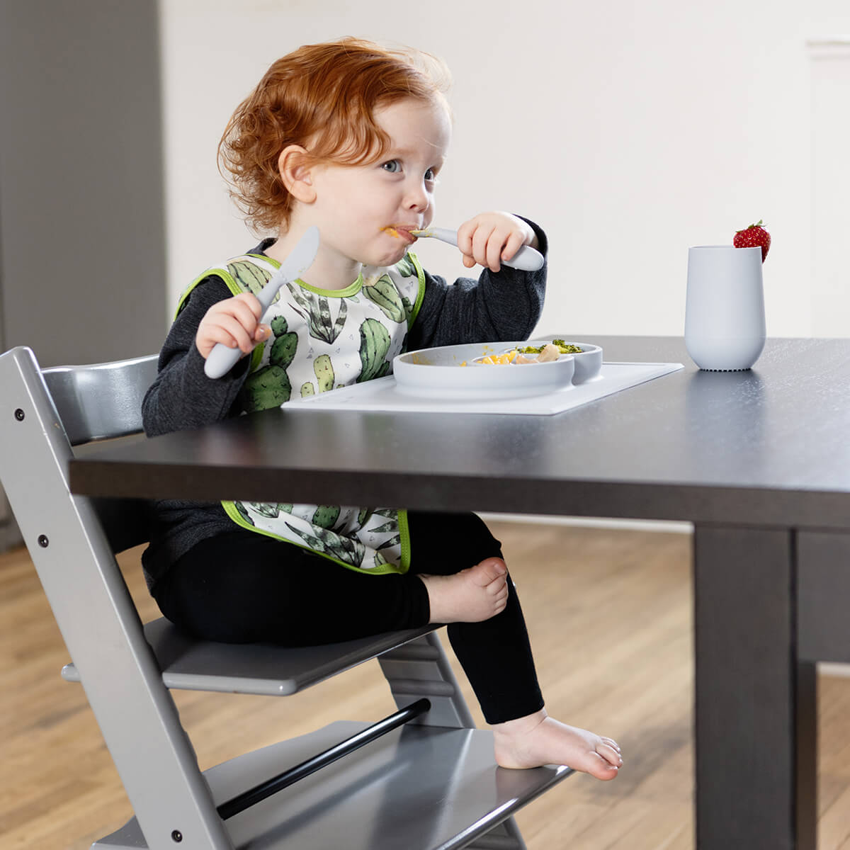 Learning self-feeding skills with utensils is an important developmental milestone. The ezpz Happy Utensils are designed to help older toddlers / preschoolers independently eat with a spoon and fork, and safely practice using a knife (spreading + cutting).