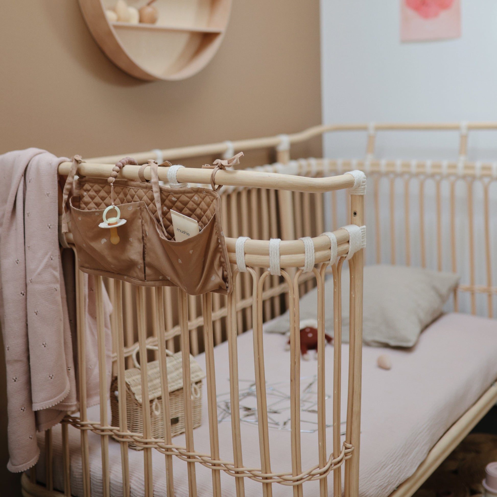 Keep your baby essentials organized and beautifully displayed in this storage pocket. Designed to accent the room and minimize clutter, this stylish storage pocket can attach to a variety of nursery furniture with 3 sets of adjustable ribbon ties